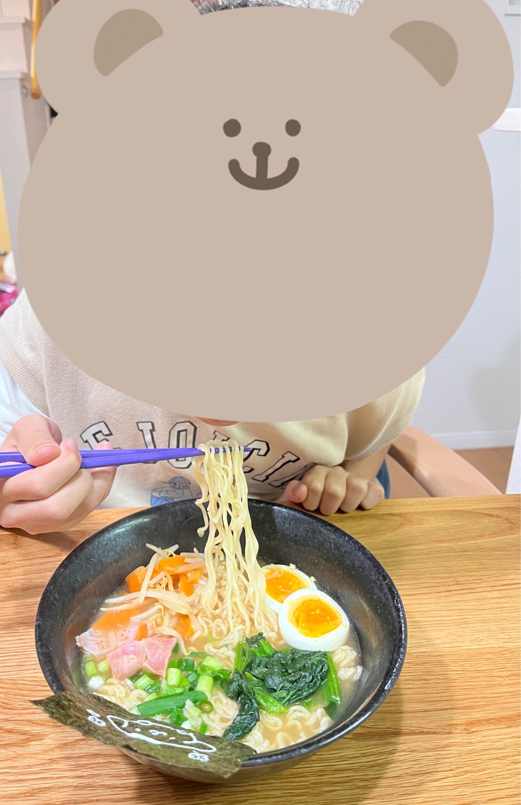 美味しそうな麺とともに、可愛すぎる海苔が顔を出しました。